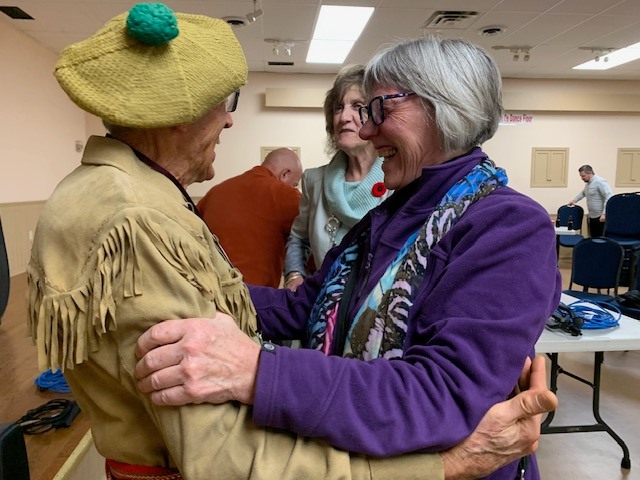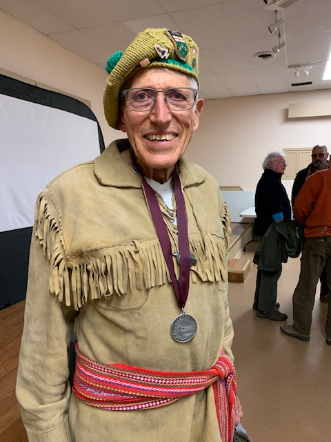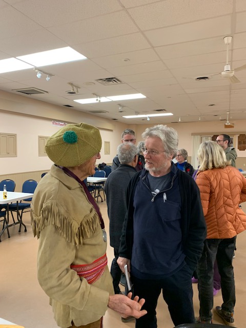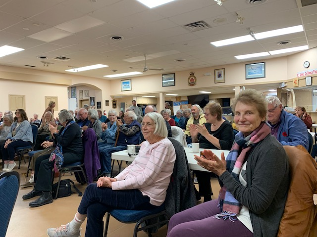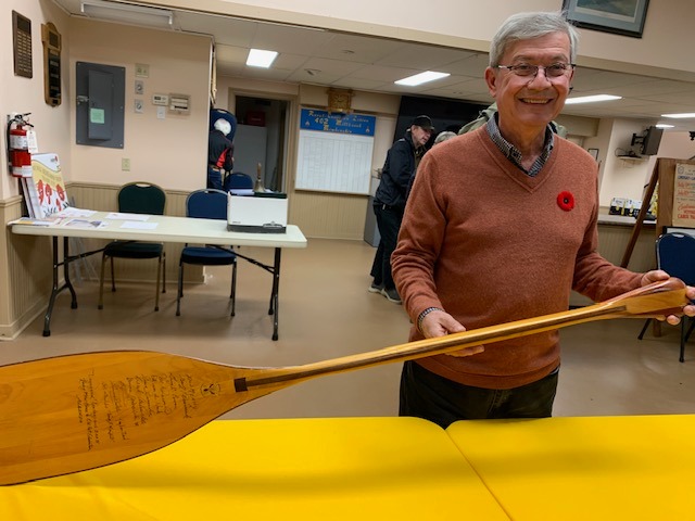 What a great night! Glenn Fallis, sternsman for the 1967 Ontario canoe in the Voyageur Canoe Pageant, held a crowd of about 100 spellbound as he described the race that still holds its place in the Guinness Book of Records. Following the viewing of the video that Glenn and Greg Cowan produced after the race, MC for the night, Dan Bourgeois, invited audience members to ask questions that prompted both amusing anecdotes and fascinating details about racing techniques and canoe construction. The smiles say it all. Thanks, Glenn and Dan!